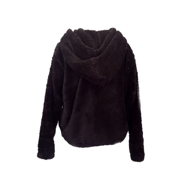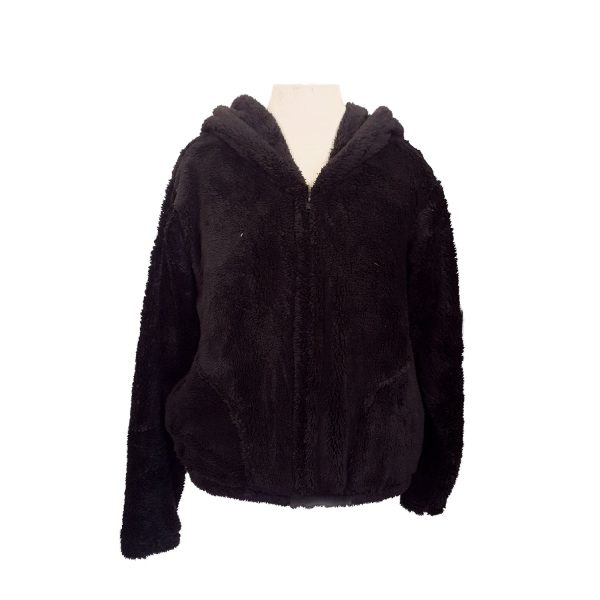 This comfy winter jacket is styled as a bomber in a fluffy black with patch pockets, an oversized hoodie and a zip. These are lovely to relax and snuggle up in at home as well as keep warm on a chilly night.